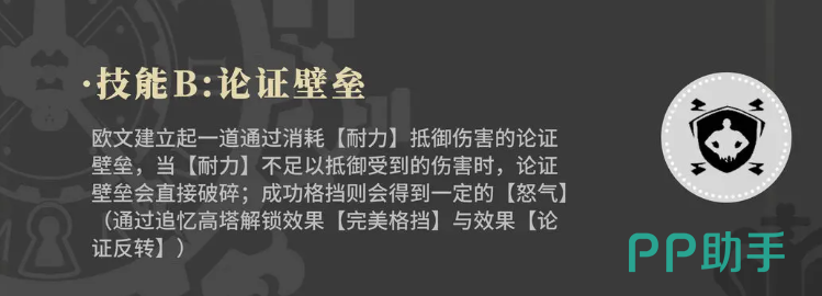 该装置落地后会在一定范围内释放电击效果,处于区域内的敌人都会受到持续伤害。此技能在运作期间会消耗斗志资源,但换来的群体清怪效率非常出色,适合应对密集小怪群。二技能为论证壁垒,属于防御型技能,依赖前期积累的耐力值展开护盾屏障。该屏障能有效抵挡外部伤害,并在成功格挡后返还部分怒气值,虽然回复量不及小发明技能,但在高难度副本或PVP对抗中,这一防御手段极为实用,是保障生存的关键技能之一。