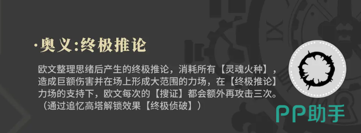 欧文最具威慑力的技能是其奥义技,需通过追忆高塔逐步解锁。该技能启动时会消耗全部灵魂火种,在周围形成大范围力场,力场覆盖的所有敌人都会遭受一次特殊普攻。不同于常规普攻,此次攻击额外附加三次强化打击,在爆发输出方面远超其他技能。随着追忆高塔后续关卡的解锁,该奥义还可进一步升级,提升整体威力。