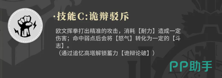 三技能名为诡辩驳斥,是一项高风险高回报的进攻技能,要求使用者具备精准的目标判断能力。施法时欧文会向前突进挥拳,回击伤害基于当前耐力值计算。若命中目标,虽有较高基础伤害,但仍低于弱点打击的倍率。该技能后期可将怒气转化为斗志,进一步增强自身状态,从而实现输出强化。然而,若怒气不足,则转化出的斗志有限,可能导致强化效果不明显,因此必须确保能量充足后再行释放。