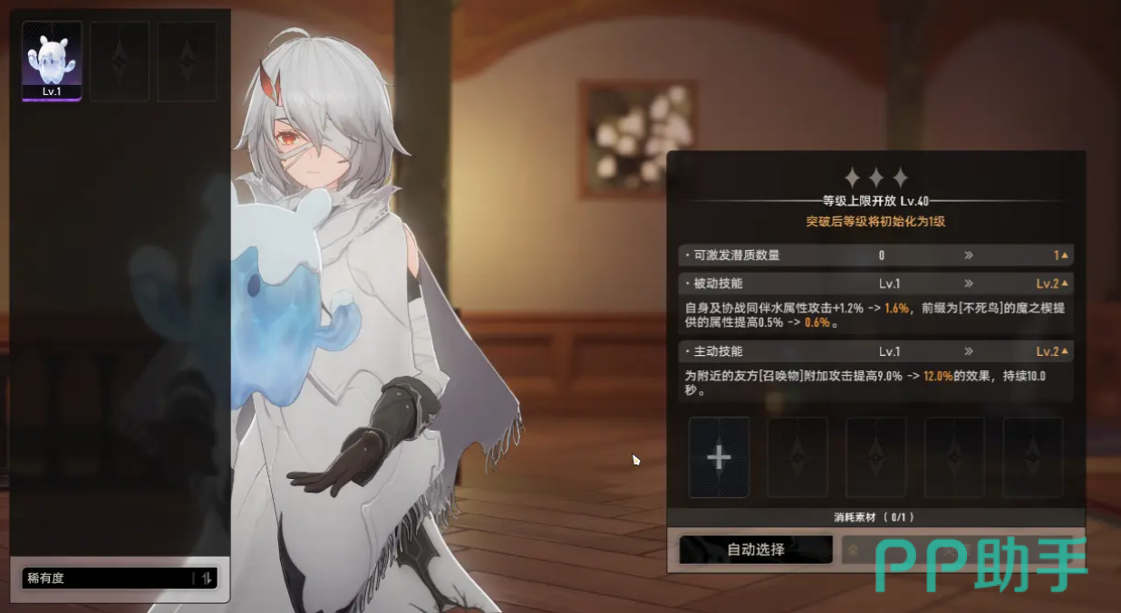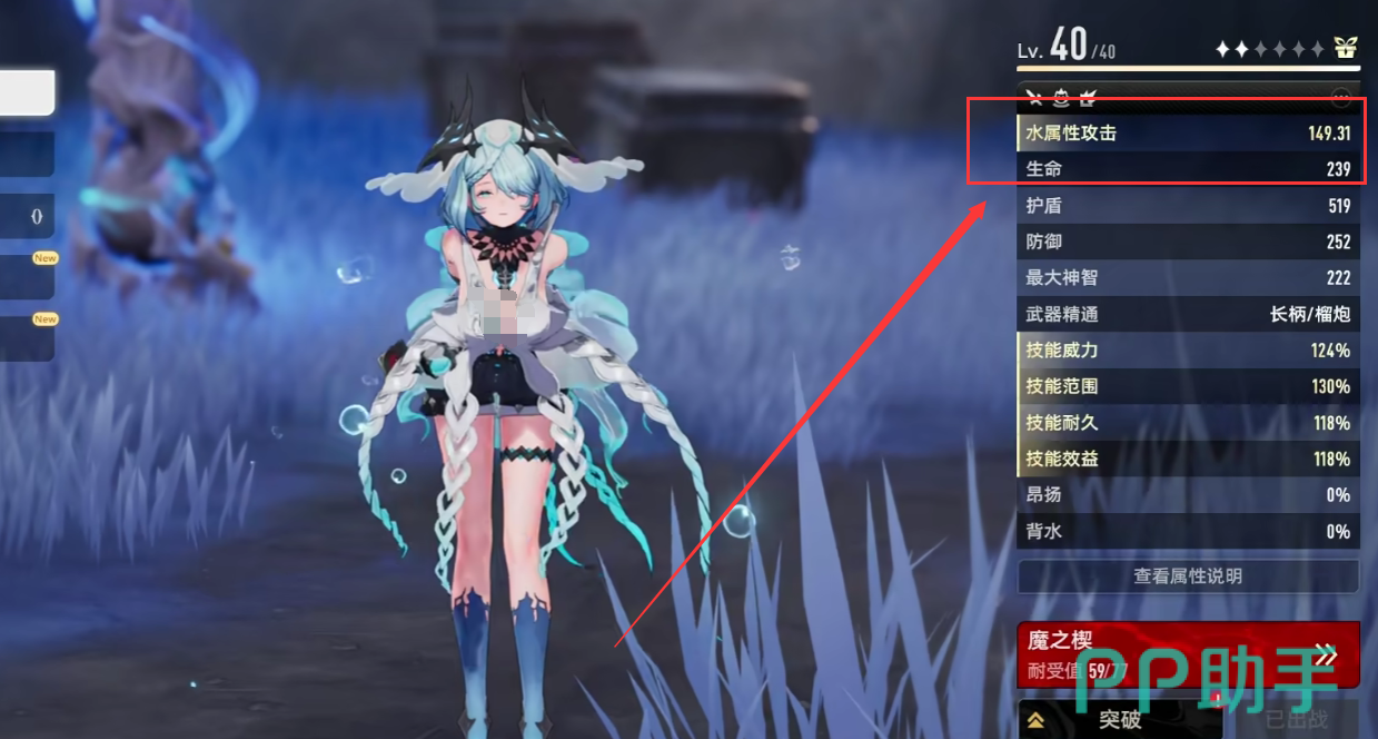她的被动技能则进一步强化了水属性阵容的整体输出能力,可使自身及协同作战的队友获得4.8%的水属性攻击倍率提升。若主角色前缀为契约者、百首或狮鹫,则额外再提高1.8%的水属性伤害加成。此被动为常驻型增益,无需触发条件,但仅对水属性队伍生效,因此在阵容构建时需特别注意搭配方向。