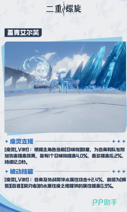 在《二重螺旋》这款游戏中,堇青艾尔芙作为水属性召唤系的增益型魔灵,其技能机制和实战表现究竟如何?不少玩家对此充满疑问。作为一个专注于辅助与增幅的角色,她的能力会随着场上召唤物数量的增加而不断提升,本期内容将深入解析堇青艾尔芙的技能强度与适用场景,帮助大家更好地理解这一角色的战术价值。