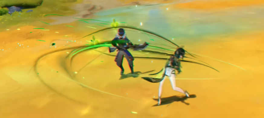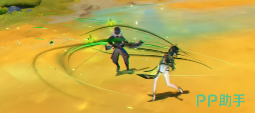 她的元素战技为“弈术千夜一舞”,施放后会向前突进并对路径上的敌人造成范围草元素伤害,同时立即进入“影舞状态”。若此时已积攒至少1枚“草露”,则重击动作将被替换为特殊攻击“幻戏”,初始可释放两次。此技能召唤出虚影协同作战,打出多段复合伤害,且伤害同时受益于角色自身的攻击力与元素精通属性,适合搭配高精通装备体系发挥最大效能。