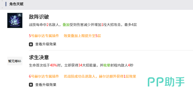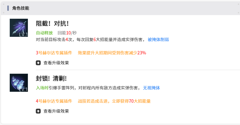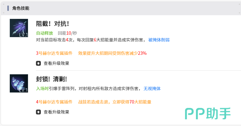 装备和插件方面不可以忽视的就是威雷什塔尔,每1.2秒就可以射出一发,而且还可以造成50%的溅射伤害,完全可以符合群攻的需求。在提升到高阶之后,还可以增加侧击的伤害,可以进一步的强化输出。插件优先去凑专属的插件,例如3号插件就能在大招期间有效减伤23%。4号插件可以让战斗技能在击退时还可以回复70点的大招能量。另外还需要搭配5号插件以及6号插件,这4个专属插件在凑齐之后,那攻防能力自然就可以上一个全新的台阶。