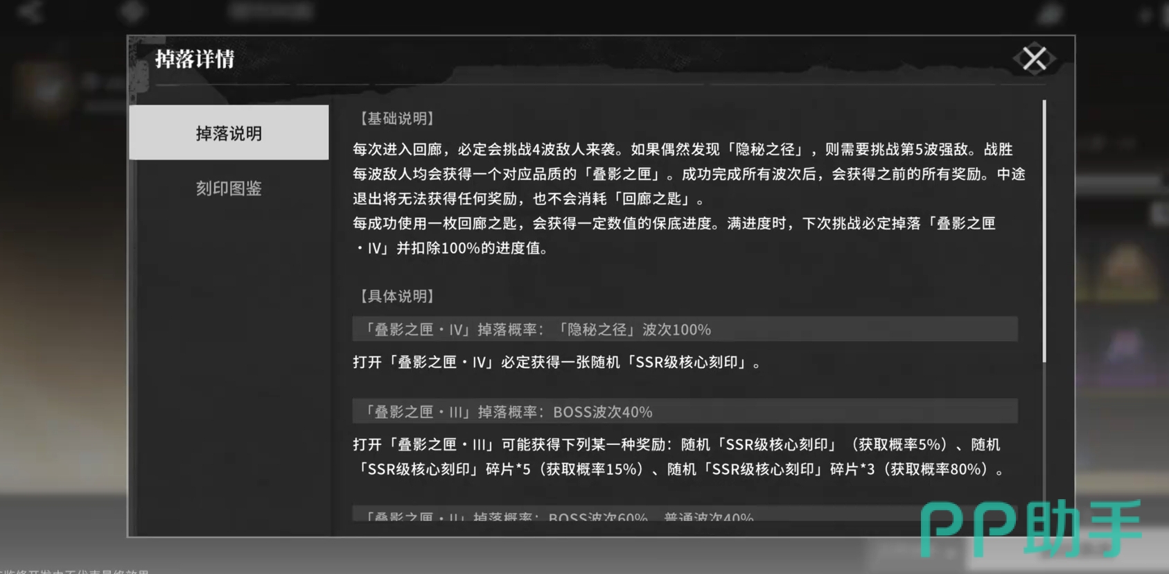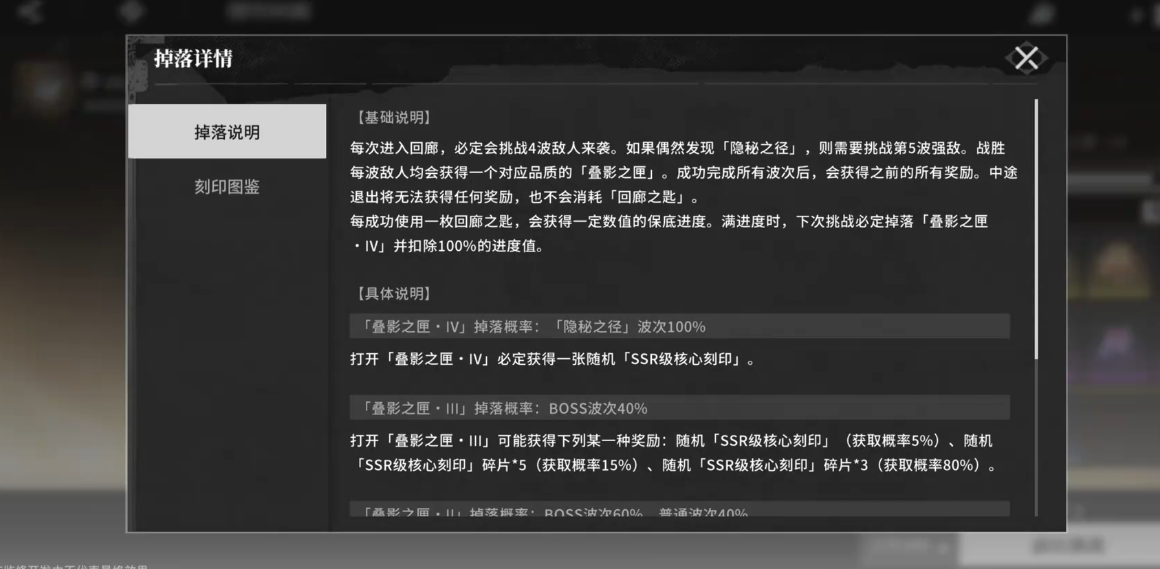 刻印回廊里除了会掉落刻刻印碎片供玩家们去进行合成外,它也有概率会直接掉落成品的角色刻印,甚至是ssr品质的刻印也都有概率在刷取时获得。同时,刻印回廊还有保底机制,每次挑战时都会累积叠影之匣的积累进度,一旦进度积累至顶峰,那么下一次挑战结束后,各位必会拿到一张角色的专属刻印,只不过该刻印会在奖励里的所有刻印里随机抽取,各位无法指定奖励的内容。此外,角色的专属刻印并非只会在叠影之匣进度条积累满后才会出现,每次完成挑战打开战利品都有概率获得,只是概率会比较的小。