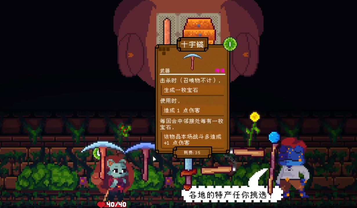 十字镐一般在第一章地图的商人处就可以购买,随机刷新十字镐商品,耗费为35宝石。十字镐可以说是新手前期的神器,本身伤害值就不错,而且在前期玩家的宝石资源极为有限,在怪物血量不高的情况下可以利用十字镐来快速刷怪获得宝石。从而赢得丰富的前期积累,在后续的商人购买中能够刷新出更强的神器。在利用十字镐时,一定要让它放置在背包中间,周围尽可能多留一圈范围地图可镶嵌宝石,让其伤害更大加强,迎战初期的boss时拥有更多的容错性。