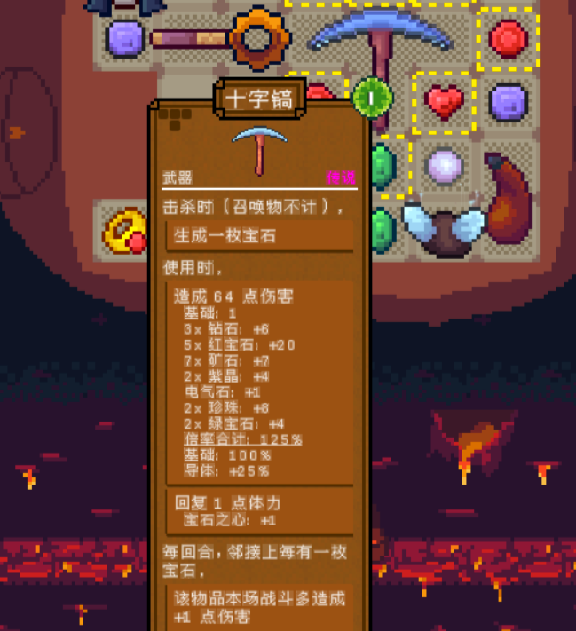 背包英雄的玩法是需要玩家在有限的背包空间中整理收纳,将不同大小的武器尽可能多的安排在有限的格子空间,实现最大强度的攻击力,从而在后续的闯关中能够更好的迎战怪物。十字镐以T字形态展现,占据四个格子,基础伤害值为64,击杀怪物时可自动生成一颗宝石,但无法对召唤物生效。装备后还会产生宝石之心的效果,额外回复1点体力值。另外十字镐还有个独特功能,当其放置在背包中间时,相邻的格子每有1颗宝石,则战斗伤害值会额外+1。加上自身可不断产出宝石,因此可以产生不错的伤害提升循环,刷怪效果奇佳。