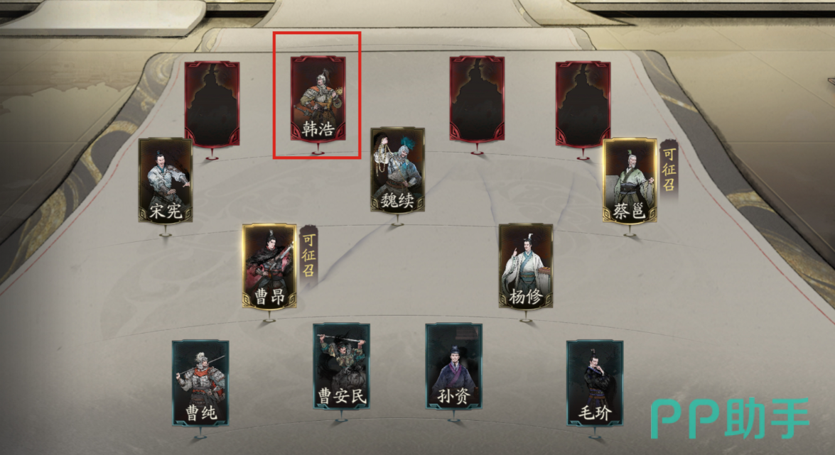 韩浩在游戏当中,是曹魏阵营的高品阶副将角色, 基础物理防御为六点,基础物理攻击为九点,他的主要技能是“镇军”,在造成aoe伤害之后,可以使得主将单位,提升5%的物理攻击倍率,同时附带有3.2%的攻心效果,该效果最多可以叠加三层,持续时间为三个回合。