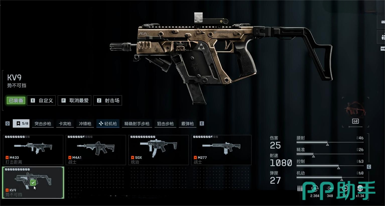 第三把推荐KV9,虽然默认弹匣容量有限,但换来的是高伤害与超高射速的组合优势。在中距离对战中,仅需5到6发命中即可击倒敌人,威力不容小觑。经过少量练习即可掌握其后坐力控制方式,上手门槛较低。通过合理装配配件还能有效扩容弹匣,进一步弥补短板,整体综合表现十分强劲。