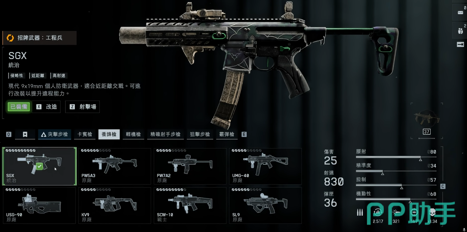 第一款推荐的是SGX,基础伤害为25,射速达到每分钟830发。这把枪在近距离作战中输出极为可观,同时具备良好的改装潜力,可通过配件优化提升中远距离的稳定性与命中率,属于适应多种战斗场景的全能型冲锋枪,非常适合新手和追求全面性能的玩家使用。