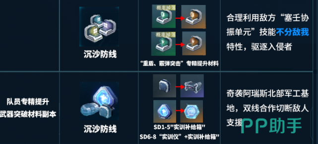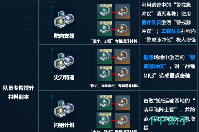 另外玩家还可以去关注深红武装副本,这里就是培养武器的所在之地。主要的获取材料就是武器兑换币,还有模组数据单元以及活性合金锻料。前两者是更换武器,还有刷模主词条的关键,后者就是工程职业在提升专精时的必要材料。想要给队伍配强力的武器,想要养医疗队员,那这个副本必须要刷满。接着就是职业专精材料本产出完全是对应自己的职业,所以千万不要搞混合。靶向支援副本就可以获得影刃职业,还有冲锋突击职业的专精提升材料。