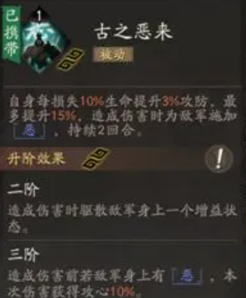 在技能效果上面,他有一个核心的技能,叫做古之恶来,这个技能效果的话,就是典韦的一个核心看家效果,主要带来的是他自身血量越低的时候,带来的攻击防御数值越高,而且在最多的情况下,这个技能能够提升的百分比达到了15%,也就是说半血的时候,典韦他的能力达到的峰值是最高的,同时造成伤害以后,还可以给敌人施加攻防降低的影响,这里敌人受到影响之后,自身在攻击及防御上面会有10%的降低效果,而且会持续两个回合,那么这样在升级之后,他还会达到额外驱散敌人一个正面增益的影响能力。