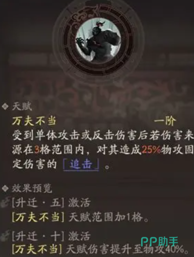 在天赋上面,典韦有一个万夫不当的效果,主要是可以加强在回合之外的一个追击伤害,如果他受到对面的单体攻击,或者是对面反击动作伤害的时候,他可以在三格的范围之内找到这个敌人,然后对这个敌人带来一段追击类型的伤害,典韦在后期升星之后,其实也可以根据这样的天赋效果提升自己的输出范围,以及提升伤害,目前的话其实是没有敌人可以做到3个以上范围攻击的,而典韦就是其中能够达到这个范围攻击的唯一武将,所以他不用提阶的话输出也是非常高的。