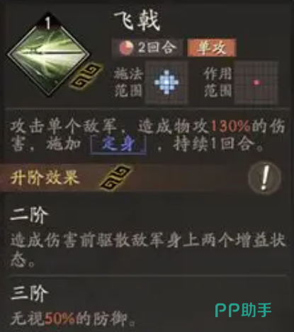 典韦的另外一个核心技能可以为他搭配飞戟,这个技能很多角色觉得是没有什么就业空间的,其实如果是用这个技能来围殴boss的情况下,也可以用来代替一个直冲御敌的效果,因为这个技能主要是给单体的目标带来伤害,造成了130%的物理攻击之后,还可以附加一个定身的效果,所以敌人如果后期行动回合太过敏捷的话,这里提升效果用处还是比较多的,那么在敌人行动的回合里面被提升效果影响的话,他就无法进行移动,而且技能升级之后还可以计算敌军身上的两个正面增益。
