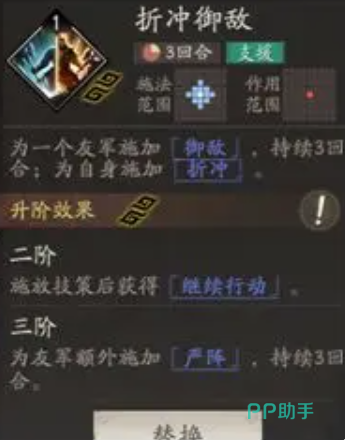 所以敌人如果身上有增益状态的话,这里他还可以获得10%的吸血,也是10倍于典韦的自身天赋效果,除了这个技能非常适配典韦的能力之外,他还有一个另外的技能,叫做折冲御敌,这个技能相对来说是可以让他获取继续行动的能力,且可以在上场的时候为友军施加严阵的效果,严阵在这里的话,是为他带来一个减伤的效果,如果敌人攻击典韦是被严阵这个技能给挡住的话,那么此时他身上降低的伤害达到了10%,而且这个技能持续的时间是比较久的,达到3回合。