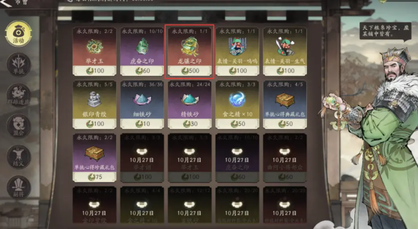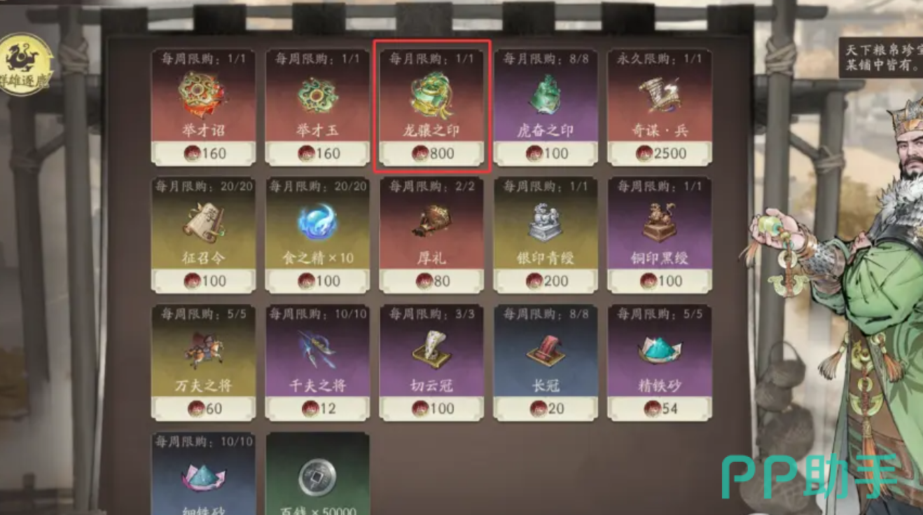 第5种方案是玩家在商店内直接购买,周期性刷新的商店是群雄逐鹿商店,每月会补充一个龙骧之印的货品,玩家使用代币进行兑换即可,值得一提的是,群雄逐鹿商店属于pvp战斗商店,玩家必须取得pvp竞技积分,才有代币可供兑换。