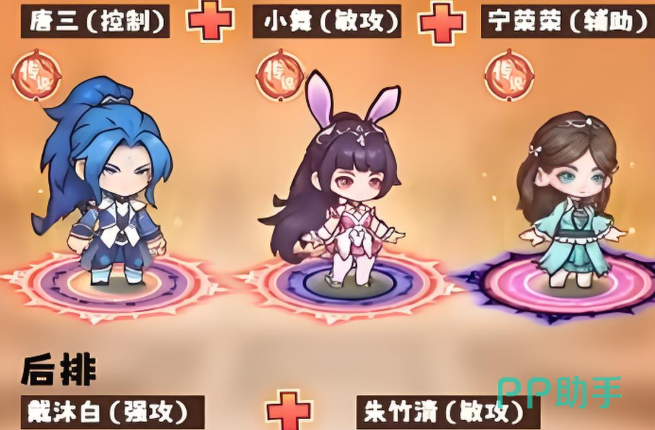 然后队伍里面的唐三,他就是控制角色,他控制的同时,是可以附带一些大范围的能力,在控制达成的情况下,还可以给到一些额外的伤害,虽然数值上面没有单体伤害那么高,但是毕竟也是出伤害的效果,所以要求在这里的话也是不那么高的,给到控制之后,还可以降低敌人的血量,那么这里给双输出也可以带来更好的输出空间,宁荣荣,作为辅助的话,提升的防御能力以及输出能力都是综合效果比较高的,有这个角色在的话,其他的队友在生存上面就可以有比较高的效用,那么戴沐白在这里作为前排的角色,他的身板是有不错的抗伤效果,而且也可以给团队里面需要一些群体输出的时候补充一下数值,也可以配合唐三的效果,给全体的输出环境带来更有优势的平推效果。
