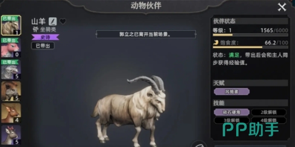 第三个就是山羊,这类异兽的话,其实大家通过在野外攻击可以获取它身上的一些皮毛道具,这也是大家前期可以收集的一类资源,如果获取这类材料的话是可以让大家后期做一些装备的,但是如果前期大家想要利用山羊来作为自己的采集加成伙伴,这里可以用到的是山羊在石头方面采集的加成效果,前期大家建造自己家园房屋的时候都是需要用到大量石头的,还有大家要建造石斧以及石矛的时候,石头也是必不可少的一个资源,而且相比木头来说,石头的获取上面一次收获的数值会更低一些,所以这里山羊能够为大家带来足够的数量加成,大家在建造上面需要的石头根本就不用担心了。