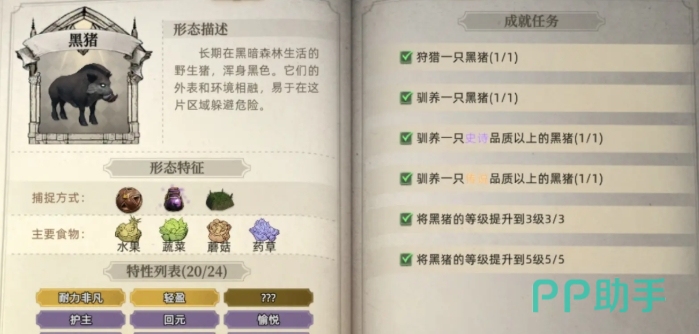 那么第二个为大家推荐的就是碎木野猪,碎木野猪其实在游戏当中跟黑猪的这类异兽效果是差不多的,所以大家可以从中选一获取,如果大家手中有这类异兽的话,都是可以让他们去帮助大家进行采集的,因为他们在大家获取木材类资源的时候是可以带来效率提升的,所以在前期一般是新手时期大家获取木材的情况下,这类宠物给大家带来的加成是最高的,特别是前期大家建造自己营地的时候,需要的木材数量特别多,那么在此时期,大家想要节省获取这类材料的时间,那么就可以先收取一个野猪类型的异兽,这里大家可以根据自己遇到的地图难度选择,先选择一个好打的野猪异兽。