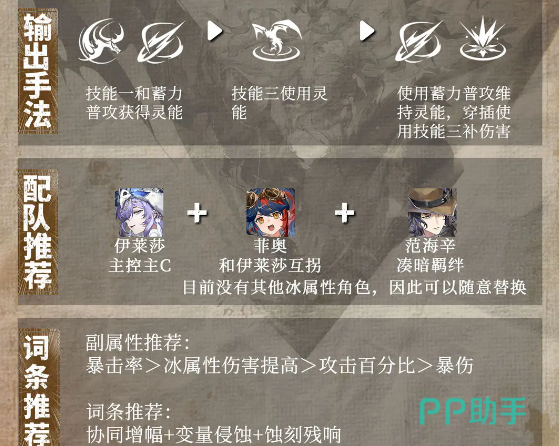 伊莱莎还需要注重与队伍的搭配和技能的搭配。先使用第一技能或者是蓄力攻击去积攒灵能,等到灵能快满时就穿插使用第三技能可以打出爆发性的伤害。接下来只需要循环往复,并不需要记住复杂的连招,新手练两把就可以掌握。在队伍搭配方面,首选非奥,两者之间可以相辅相成,搭配在一起使用强度就能够提升。还可以搭配范海辛去凑暗羁绊,进一步的提升队伍的整体属性。目前游戏中冰属性角色并不是很多,范海辛可以作为重点。