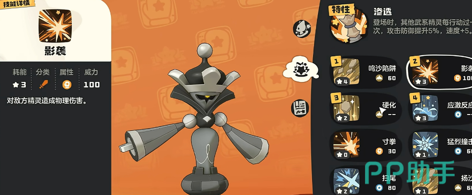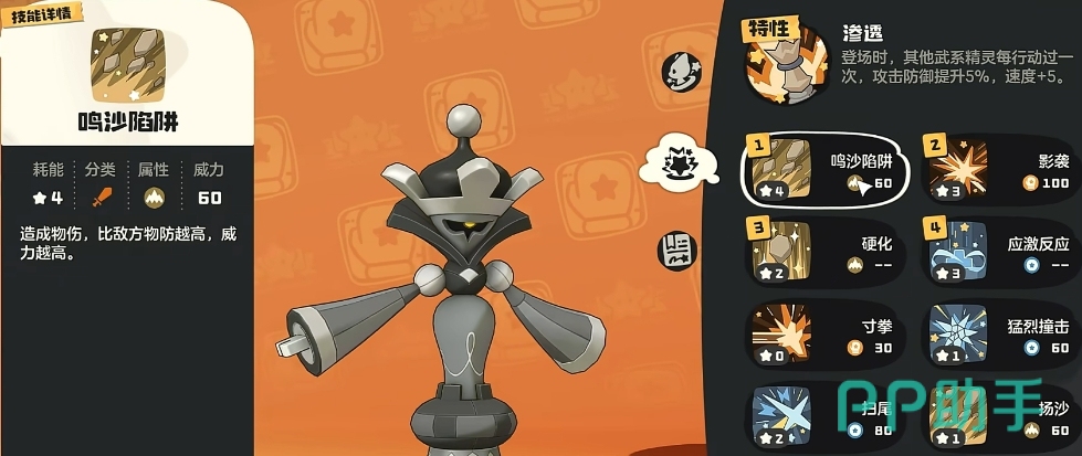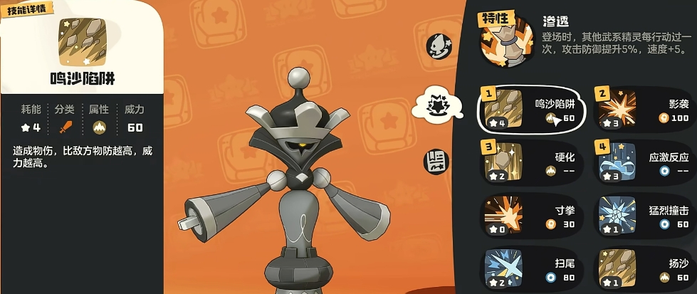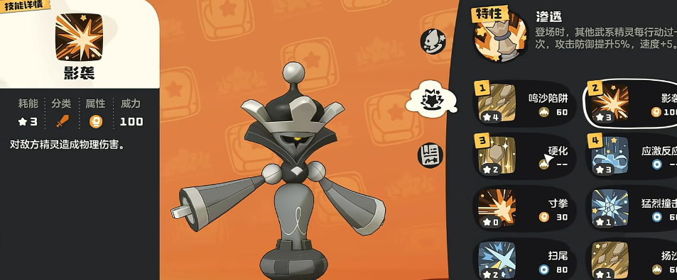 鸣沙陷阱作为棋绮后的攻击技能,也十分符合棋绮后的地系特性,棋绮后本身就有着较强的防御,通过增加物防来增加自身的生存能力,当棋绮后积攒了足够的防御值之后,鸣沙陷阱不仅可以攻击到敌人,还可以在一瞬间将敌人的血量进行大幅度的扣除,甚至可以将满血的敌人直接秒杀。影袭是棋绮后另一个强大的攻击技能,是增强她收割能力的技能,当对手精灵血量较低时鸣沙陷阱可能不太合适,因为影袭针对残血的敌人效果会比鸣沙陷阱差,所以影袭弥补了鸣沙陷阱的缺陷,可以在对手精灵血量低时快速秒杀对手。