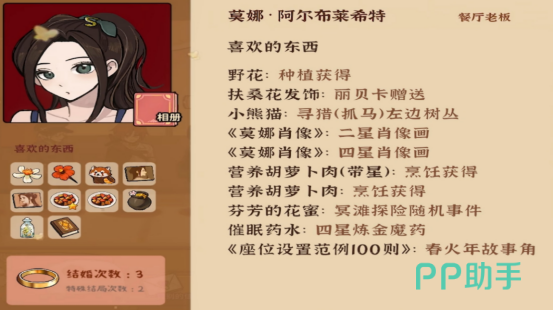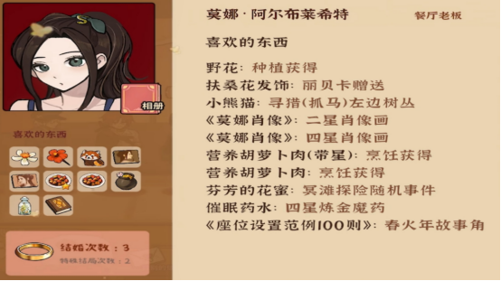 其次,在游戏中,莫娜是一名优秀的厨师,可以给主人公和所有的成员制作出各种口感独特的美食,如果赠送睡火莲的话,那么分数值也可直接达到5分,其次还特别喜欢的就是勿忘我可增加两分好感度。雷贝莎喜欢的是茉莉花以及银匕首,其中还有专门的主线任务,只要完成主线任务之后,也可获得专属的剧情物品,那就是奴隶脚铐。
