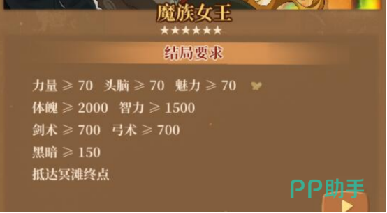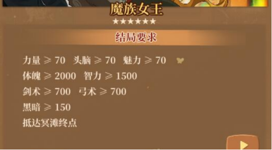 想达成魔族女王这个结局的时候,也需要具备一些属性要求,首先就需要竭尽全力的让头脑以及魅力值等多个方面,都大于或等于70以上。其次第2个要求,那就是要确保自己的体魄值大于或等于2000以上。还有核心的要求就是黑暗属性必须达到大于或等于150以上,在此项结局中,格温妮丝是很重要的人物角色也需竭尽全力增加彼此之间的好感度,只要彼此的好感度达到100以上就可触发此条件。