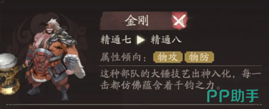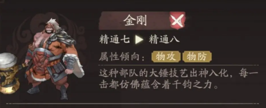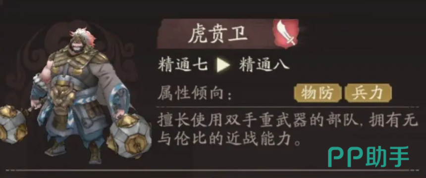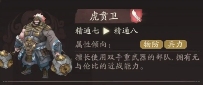 那么在被动效果上他可以带一个阻敌技能,不仅可以给他自身带来物理攻击,提升20%的数值,还可以带来一个阻挡领域,不让敌人进行通行,那么如果走的是虎贲卫线的话,其实在一些小兵比较多的关卡,用泰山压顶这个技能就可以给他带来足够强的效果,泰山压顶这个技能主要是可以位移到一个空地的格子上面,此时对周围一圈的敌人都可以造成物攻50%的伤害,并且在打成伤害之后,再一次击退十字格范围之内的敌军,所有收到他击退范围效果的敌军都会后退一格,此时对于位移受到阻挡的敌军来说,他会增加一个额外的眩晕效果。