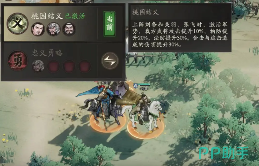 某些将领之间是存在着羁绊关系的,你也可以根据这个来决定本场上场的配置。如果你是一名新手玩家的话,那么小编最推荐的配置就是刘关张,这个配置无论是输出、坦克还是治疗都是比较齐全的,并且可触发羁绊关系桃园结义,己方所有武将的攻击力提升10%,物理防御提升20%,法术防御提升30%。如果成功对敌人造成合击或追击,则造成的伤害提升30%。新手玩家需要面对的大部分副本都可以通过这个配置来解决,其余的两个位置大家可以根据自己手中现有的角色来进行安排。