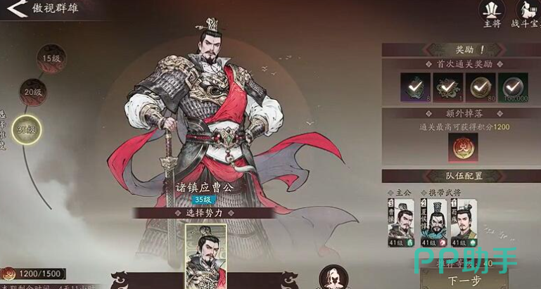 大家在其中进行挑战的话,要先完成流寇清扫战这个关卡,然后才可以解锁傲视群雄,这里大家解锁之后可以直接进入备战的页面,在备战的页面当中,大家要首先挑选自己选择的一个难度,目前从15级开始,大家就可以进行挑战,基本上是前期5级一个关卡,到20级之后就会10级一个关卡的挑战区间,建议主公在达到了推荐等级之后再进行挑战,会有更高的武力数值去进行比拼,那么除了这里要选择难度之外,然后也要挑选到3个武将进行队伍配置。