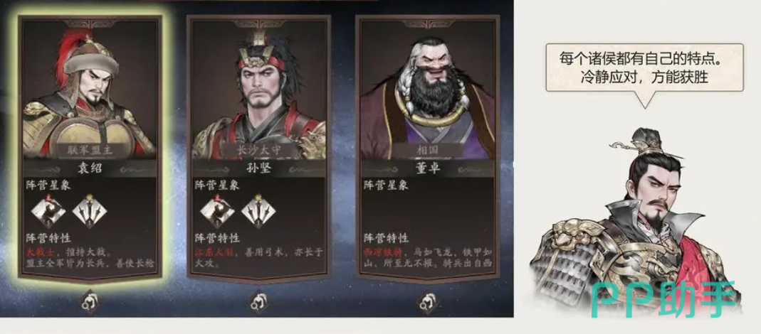 其次在形象选择好之后,还要选择自己即将要挑战的诸侯,每一个诸侯都有自己的特点在上面,比如说如果选择的是联军盟主袁绍的话,他为大家带来的特性就是会给枪类武将带来足够的增益,如果选择的是董卓这类诸侯的话,那么他在上面带来的骑兵能力是比较强的,这类诸侯都是大家可以选择的对手,所以在这里选择对手的方式还是比较自由的,后期在回合类型选择上面,大家要看不同的3个回合类型选择一个就可以了,每一次也只能选择一个,其中会有不同的战斗效果以及事件发生,休息的时候也会有不同的路线,大家选择驿站前往就可以入城修整。