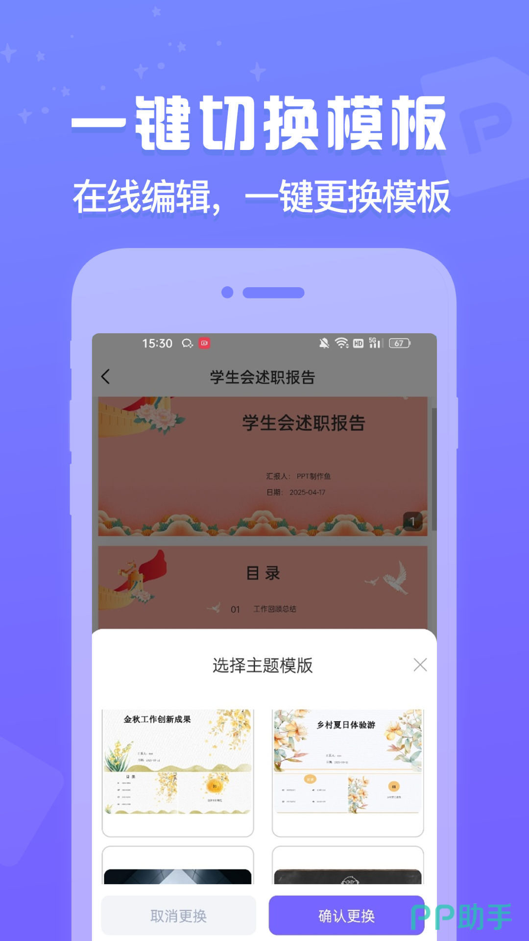 这款软件特别适合刚接触PPT制作的新手用户。智能化的内容推荐系统可以根据你输入的主题自动生成结构化框架,例如选择“销售汇报”后,系统会自动规划市场分析、业绩数据、目标展望等模块。所有内容均可一键替换,且格式自动适配,无需手动调整排版,极大提升了制作效率。
