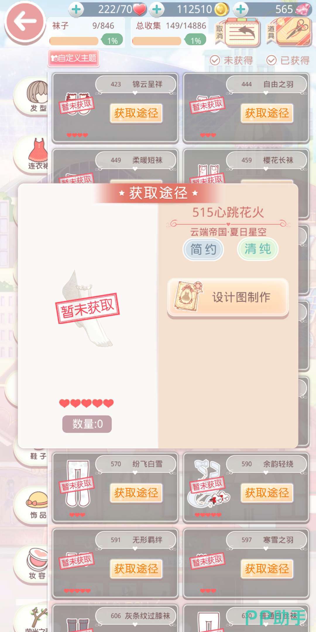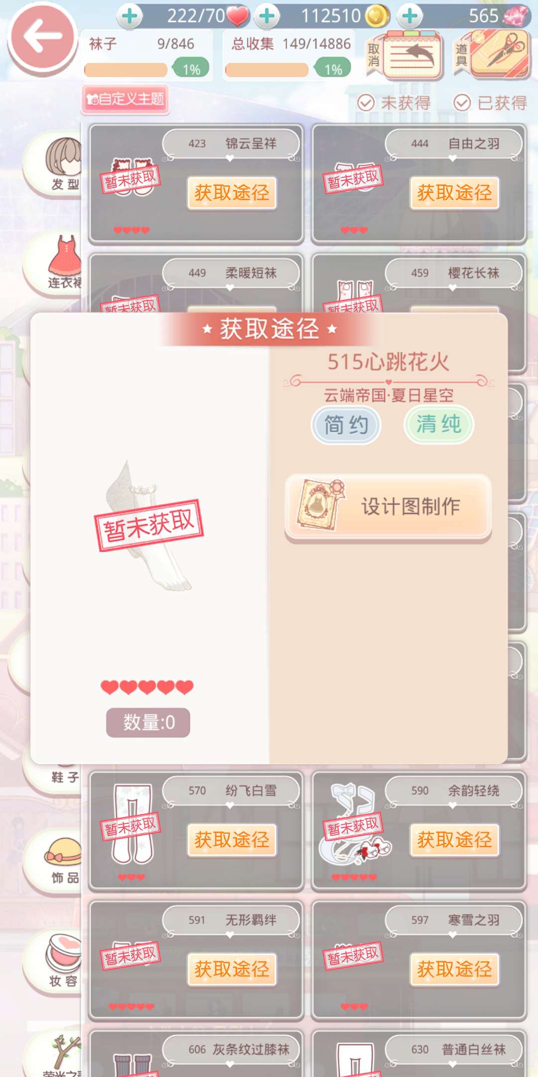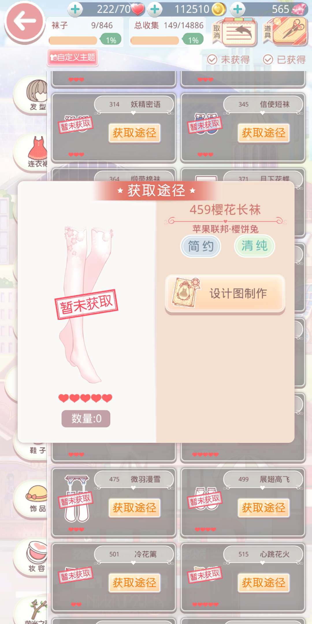 樱花长袜是五星的简约&清纯袜子,前面推荐的都是优雅清纯的服饰,需要别的风格来增加一下分数的加成。这双袜子需要通过设计图制作获得,制作需要1件樱绽春至,3件百花盛开以及9件复古心情。