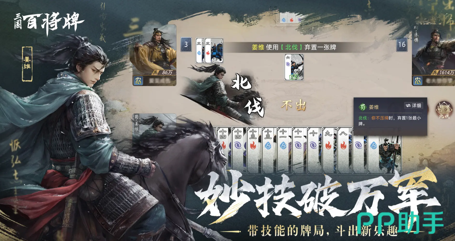 孙策的“借兵”技能可在无法压制对手时启用,通过舍弃手中点数最大的单张牌,换取一个带有多个J的对子,并跳过当前压牌阶段。该技能每局最多可触发两次,是逆境翻盘的重要手段之一。