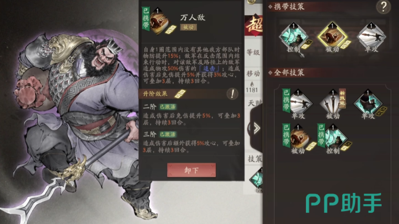 另一核心被动为“万人敌”,当张飞周围一格内无队友提供增益时,自动获得15%物理防御提升。此外,在自身行动结束后,可对范围内及移动路径上的所有敌方单位造成等同于其50%物攻的追加伤害,形同追击机制,显著增强输出效率。这一被动不仅提升了张飞的持续作战能力,也强化了其在阵型中的承伤与反打地位。