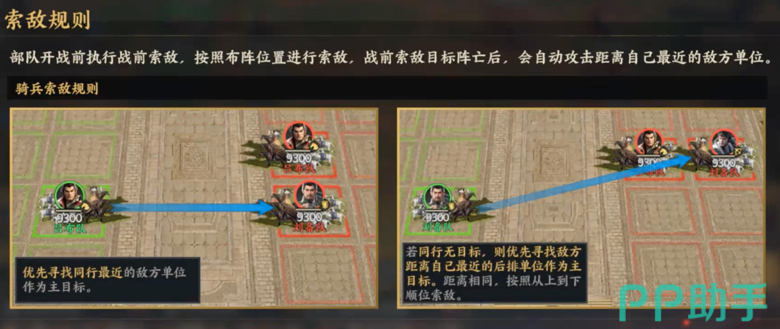 战斗开始前,系统会依据双方站位判定初始攻击目标。若目标被击败,部队将自动转向最近的敌方单位发起攻击。盾兵与弓兵通常优先攻击同列最近目标,若该列无敌人,则转为攻击全场距离最近的单位。骑兵机制略有不同,其在同列无目标时,会直接突袭敌方后排单位。当多个目标距离相同时,系统将按照从上至下的顺序进行判定。