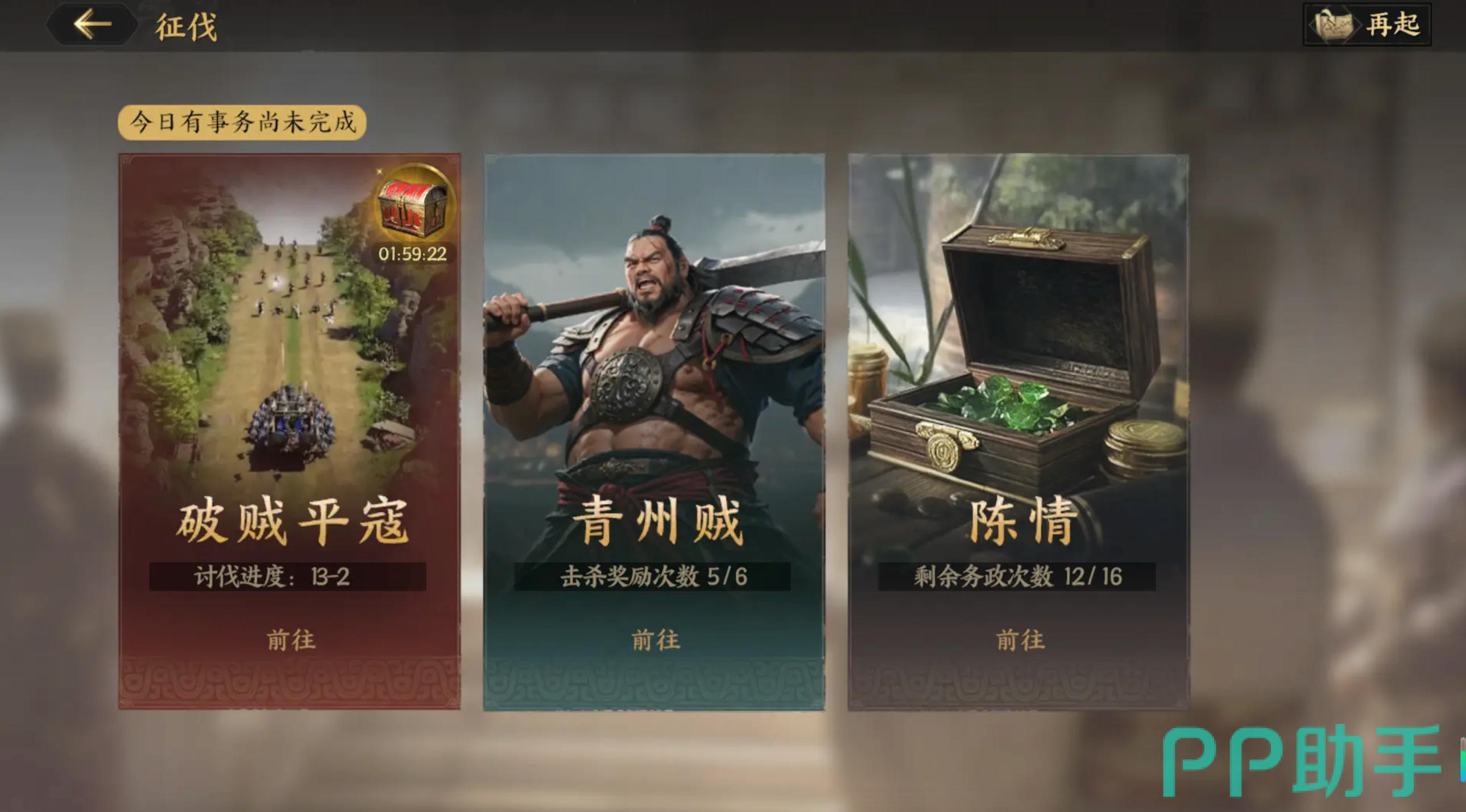 该玩法的核心目标是派遣部队讨伐各类流寇势力,如白波贼、山越、黄巾余党等敌对单位。随着关卡推进,敌人强度逐步提升,其兵种组合与站位布局也会不断变化,挑战性逐渐增强。成功通关不仅能获得基础资源奖励,还能激活挂机收益功能。挂机时间最长可累计24小时,期间持续产出武将技能经验和强化石,上线后务必及时领取,避免因时间满额而造成收益流失。