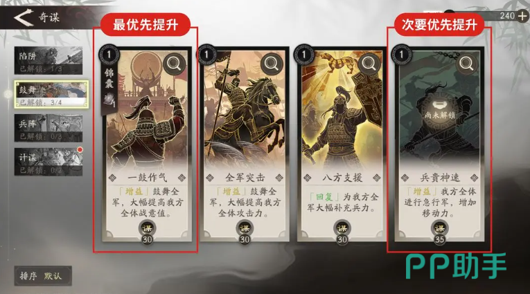 副将系统支持资源返还功能,即使误培养也可通过复原操作全额回收投入材料,因此玩家无需担忧资源浪费问题。同时,奇谋系统的合理配置能显著提升通关效率。其中,“一鼓作气”是关键奇谋之一,适用于多数高难度关卡,建议优先解锁并升级。该奇谋提供的爆发增益在攻坚阶段尤为有效。