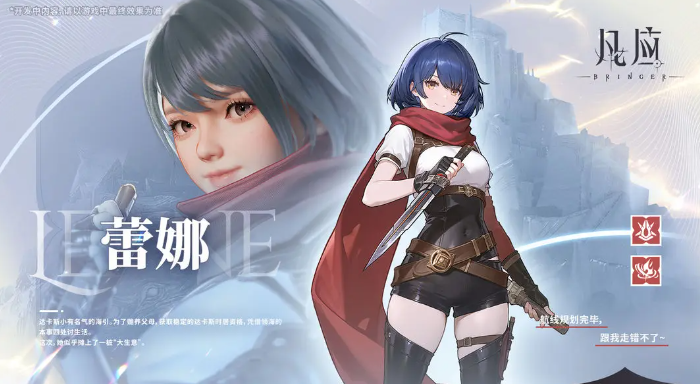 第二个为大家推荐的角色叫做蕾娜,蕾娜在游戏当中是达斯卡地区里面一个非常有名的海引,她在原著当中为了赡养自己的父母,努力获取了稳定的达卡斯居住资格,在这里的话,也可以凭借她自身厉害的本事来让自己的家人过上安稳无忧的生活,但是在游戏当中蕾娜也是一个重要的NPC,她因为遇上了玩家扮演的大主角,所以在其中决定跟随主角去冒险,蕾娜这个人物外观做起来就是一个非常活泼明艳的少女形象,蓝色的短发让她看起来非常具有活泼的气息,而身上的穿着也是非常带有利落感的,她的脖子上会围着一条非常长的红色围巾,看起来很像一个流浪者。