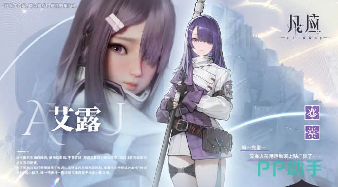 第四个为大家介绍的叫做艾露,艾露在游戏当中是达卡斯共生局里面的一员,这个角色在设定上面看起来就是比较内向的角色,整体的效果上面利用颜色搭配出来了白加紫的一种温柔感,但是这个角色的性格上面设定的是比较柔弱的,而且跟主角进行对话的时候都显得比较怯懦,并不善于言辞,但是在游戏当中,作为共生局的一员,她需要维护街头的秩序,还需要跟各种住民进行沟通,要调节他们与生态之间的关系,所以为了帮助其中的原住民掌握其中的区域规则,她是需要在街道上进行走动,以及在达卡斯的这片土地当中大家也能经常看到她,拖着一些柔软的调子跟其他的NPC进行交谈,她经常会出现在一些被人贴小广告的地址来找到这些贴广告纸的人,劝说他们。