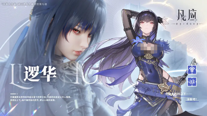 那么第三个角色叫做逻华,逻华是目前在人气上面具有比较高数值的一个女性角色,她在游戏当中是万城国里面第五序列的总司皇女麾下的一个近卫长,所以外观上面制作的非常的华丽,而且凸显了她的好身材,整体的设定上面为她做了一个蓝色为主要基调的设定,一头长发也是带有蓝色的部分元素,而身上的衣着比较大胆,她在游戏当中因为有华丽的身份,所以经常出现的剧情里面都是在万城国皇宫附近的地图,而且在跟平民百姓进行对话的时候,总是一副高高在上的模样,在游戏当中逻华她的武力值是非常高的,而且手中经常会持着一把利刃,所以逻华这个角色不仅在外观上面很吸引玩家,还带有一定的战斗强力效果,当然战斗效果目前还没有放出来,但是根据目前的信息来看的话,逻华是后期很多玩家觉得会是一个强力的角色。