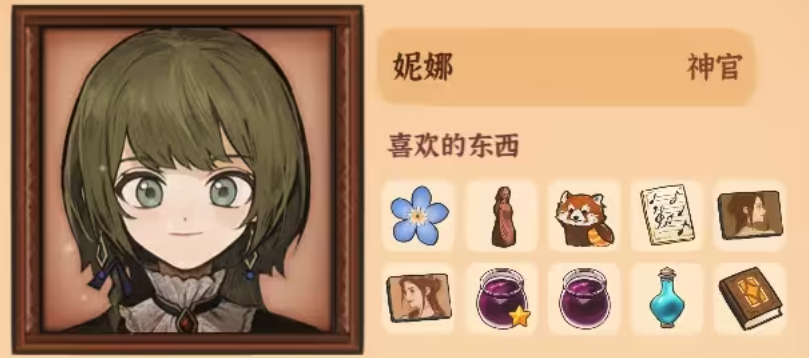 最后为大家推荐一个神官角色叫做妮娜,她在游戏当中也是非常重要的一个NPC出现的剧情当中,作为神官她的性格是非常温柔的,在游戏当中,她喜欢的话是勿忘,我喜欢的动物同样也是小熊猫,而且妮娜跟莫娜其实有一些类似,因为她喜欢的物品当中也包括了莫娜肖像,那么莫娜肖像在上面的介绍当中已经介绍过来源,其次大家还想送其他的东西给妮娜的话,这里可以通过烹饪来制作一些葡萄果酱,而且葡萄果酱相对来说是非常好制作的一个菜肴,这个葡萄果酱的话,大家也可以在炼药的时候做一些吐真剂,这个药物送给他的话,妮娜也会比较喜欢,如果是送一些故事书的话,可以将占卜的起源这本书送给她,她会喜欢这类书籍,这类物品为她带来的好感度加成其实速度是比较快的,所以如果大家想要快速攻略妮娜的话,上面的这些东西都是用得上的。