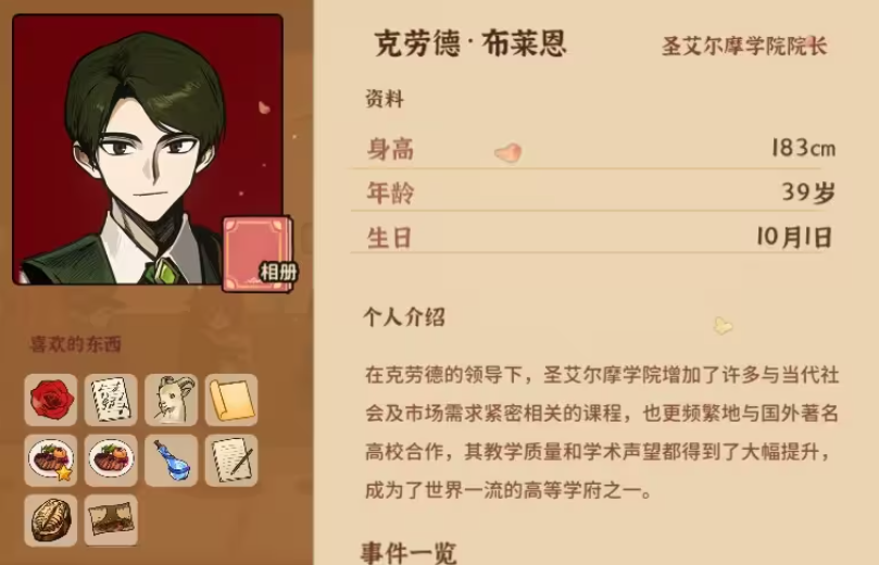 那么第二个就是院长克劳德,他是游戏当中圣艾尔摩学院的一个院长,如果是送花的话,大家就要给他送红玫瑰之类的花,然后,如果是训猎里面想要猎到他喜欢的动物,大家就要去专门猎山羊,在游戏当中,他喜欢的物品里面有野梅烧肉这个菜肴,这个菜肴大家可以通过烹饪来自己制作,然后还可以在炼药当中获取海德斯之境的话,这个物品也是可以送给他来增加好感度的,当然除了这类物品之外,他更喜欢其他的一些研究笔记,还有各种画作,比如说岩浆巨树的画作,还有各种巨树事件,都是他非常喜欢的礼物。