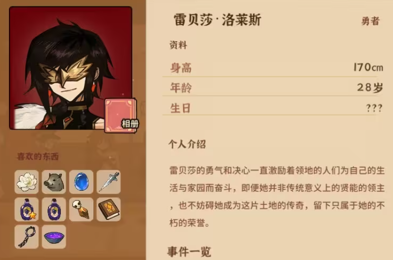 接下来为大家推荐的是勇者雷贝莎这个NPC,这个角色外观上面非常的神秘,脸上有一个类似金雕的面具,所以很多玩家也是想将这个角色给攻略下来的,在游戏当中他喜欢的花是茉莉,大家如果在钓鱼的时候钓起来这种花也可以送给他,那么后期在训练里面如果想要捕捉他喜欢的猎物,就去专门猎野猪就好了,他喜欢的物品里面有蓝色的宝石蛋,还有热葡萄酒,热葡萄酒的话,相对来说获取来源比较简单,大家通过烹饪或者是挑战任务里面也可以获取到热葡萄酒的奖励,如果是想要送他宝石蛋的话,那么大家需要去冰霜峡谷这个地图里面去摸鸟窝,因为很多鸟窝里面大家将这种蛋拿走以后,会触发一个事件,在这个事件里面完成任务就可以得到一个蓝色宝石蛋的奖励,其除此之外还有战争魔药、皇家丑闻这里部件也可以送给他。