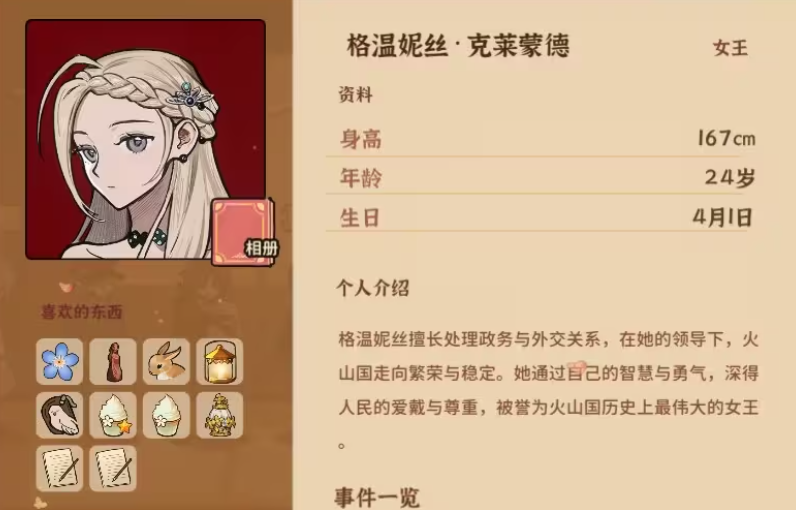 火山的女儿这款游戏当中,其实很多玩家在体验其中玩法的时候,最喜欢的还是去攻略各个NPC,毕竟这里NPC进行交互的时候给到的趣味性很多,火山的女儿各人物喜好有哪些关于这里赠送物品的玩法里面,大家想要最喜欢NPC好感度高一点的话,那么要注意并不是需要用到价值更高的角色东西去赠送,而是需要用到一些专属的角色喜好物品。