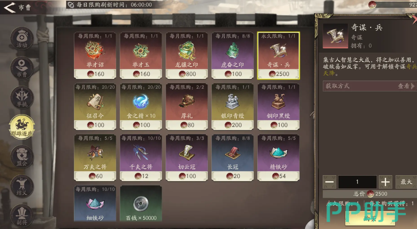 游戏内每周,还具备有限时的活动商城等待玩家领取,例如玩家可以进入到副将商城,以及市曹当中,通过指定的副将碎片,以及是市货币,来兑换游戏内的物资。