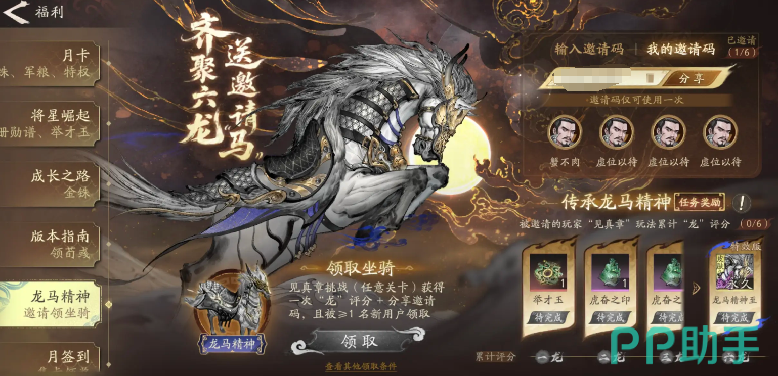 游戏当中,最值得新手玩家进行兑换的限时活动是福利“龙马精神”,玩家只需要通过,邀请其他的玩家进入到游戏内,即可累积龙这一个评分效果,当龙的数量达到了六个时,玩家即可直接领取坐骑龙马精神,该坐骑是直接免费获得的,非常适配给输出类武将使用。