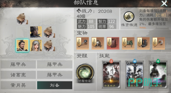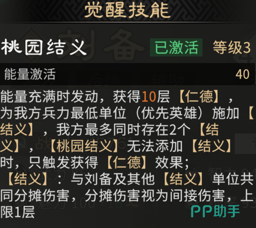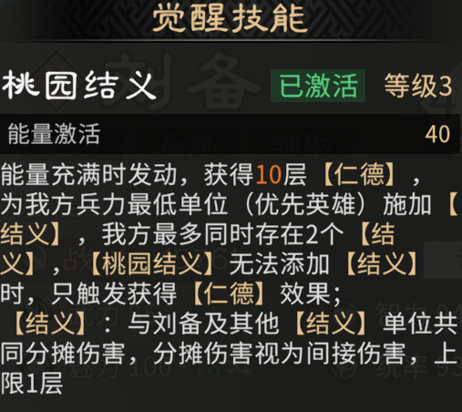 刘备的觉醒技能在战斗中也是有着决定胜负的作用,通过觉醒技能可以快速的积攒大量的仁德层数,而且还可以给到我方兵力最少的单位一个结义的效果,这个效果可以使目标分担一定的伤害,极大的提高了队伍的生存能力,特别是对于一些输出很高的脆皮角色,结义技能可以为他们提供非常强的保护。觉醒技能弥补了刘备仁德层数积累慢的缺陷,让他可以更快的为队友提供支援。