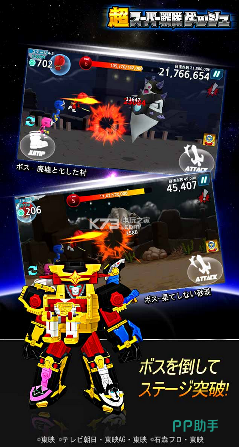 《超超级战队冲刺》每一个机甲英雄都具有着震惊四座的动作模组设计,而且制作组又引入了强化功能,在这里你将操作着不同的机甲成员,在节奏高速的关卡中,与众多群魔乱舞一般的boss进行交手,另外游戏还拓展出了各种激情四射的对决舞台,设计的操控机制,更是可以实现三个英雄同步性的释放技能进行作战。