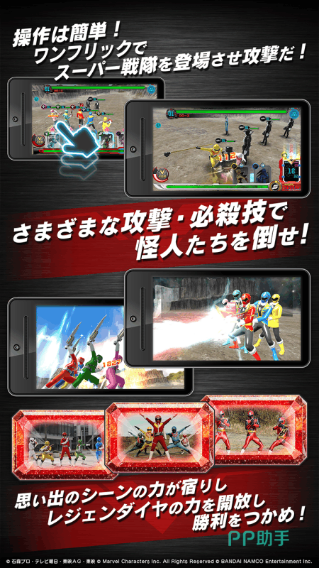 《超级战队传奇之战》本部作品原貌重现了同名漫画中所有出场过的角色,在战斗的方式上,制作组则运用了别出心裁的3d实时动作结合卡牌的玩法方式,并沿袭了日漫的制作风格,绘制出了各种让人目不转睛的卡牌插图,每一个战队阵营下设计的必杀大招,包括攻击动态各有特色,在这里人人都将成为一名正义凛然的超级英雄,为了和平义不容辞的参与到纷争中。