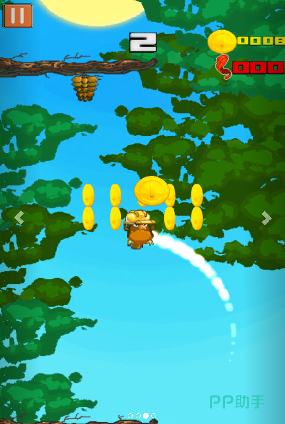 《旋转老鹰》带来了一种别具一格的操作方式——老鹰只能通过不断旋转向上飞行。游戏背景设定在一棵枝叶繁茂的大树中,玩家需要控制老鹰螺旋升空,途中收集金币和鸟蛋来补充体力。操作上要求精准掌握旋转节奏与障碍位置,一旦撞上树干,还会被树上的小松鼠嘲笑,增添了不少趣味性。